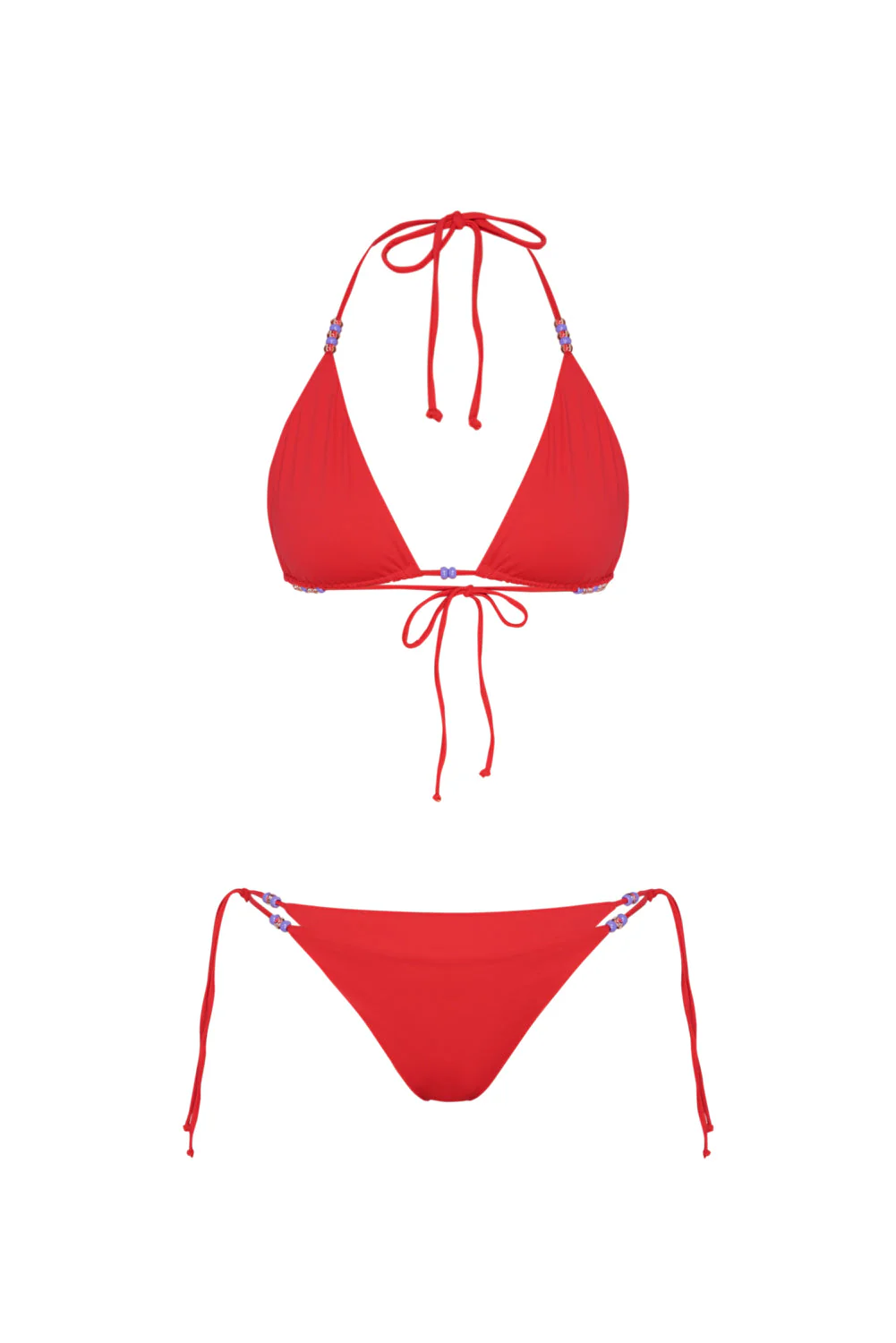 Bikini de triángulo ajustable con perlas de colores cosidas a mano. Un clásico reinventado, con un diseño atemporal en un vibrante color coral. La parte superior se ajusta tanto en altura como en contorno, lo que permite adaptar la talla a cualquier silueta. La parte inferior también se ata y ajusta con lazos. Las perlas de colores han sido cosidas a mano, cuidando cada detalle.