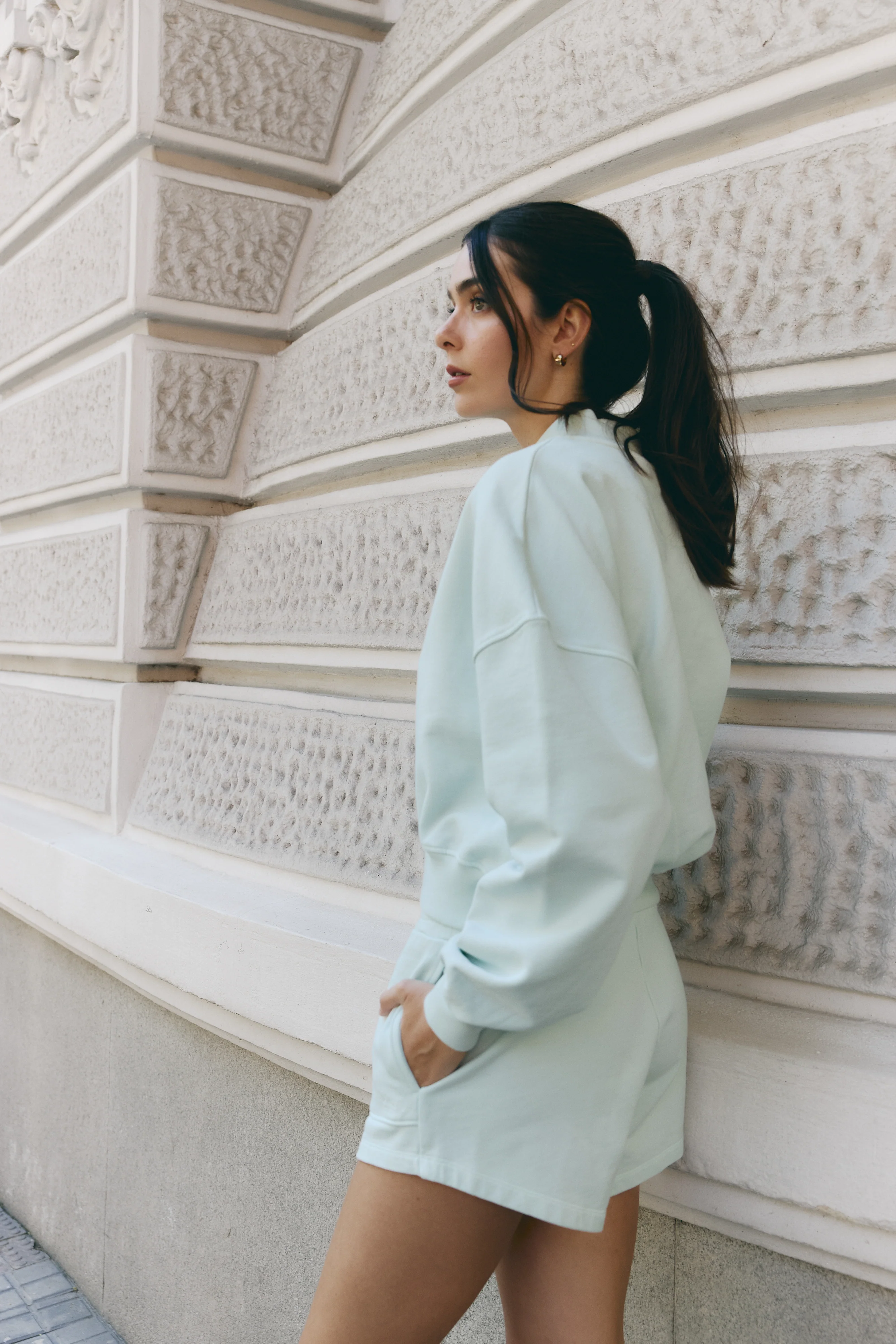 Shorts de felpa de algodón. El diseño está inspirado en los boxer shorts centrando la prenda en su cinturilla elástica de tiro alto. El bajo tiene una curva en los laterales para alargar la figura y aportar comodidad. Combínalo con las sudaderas Butter cream o Blue bay para un total look.