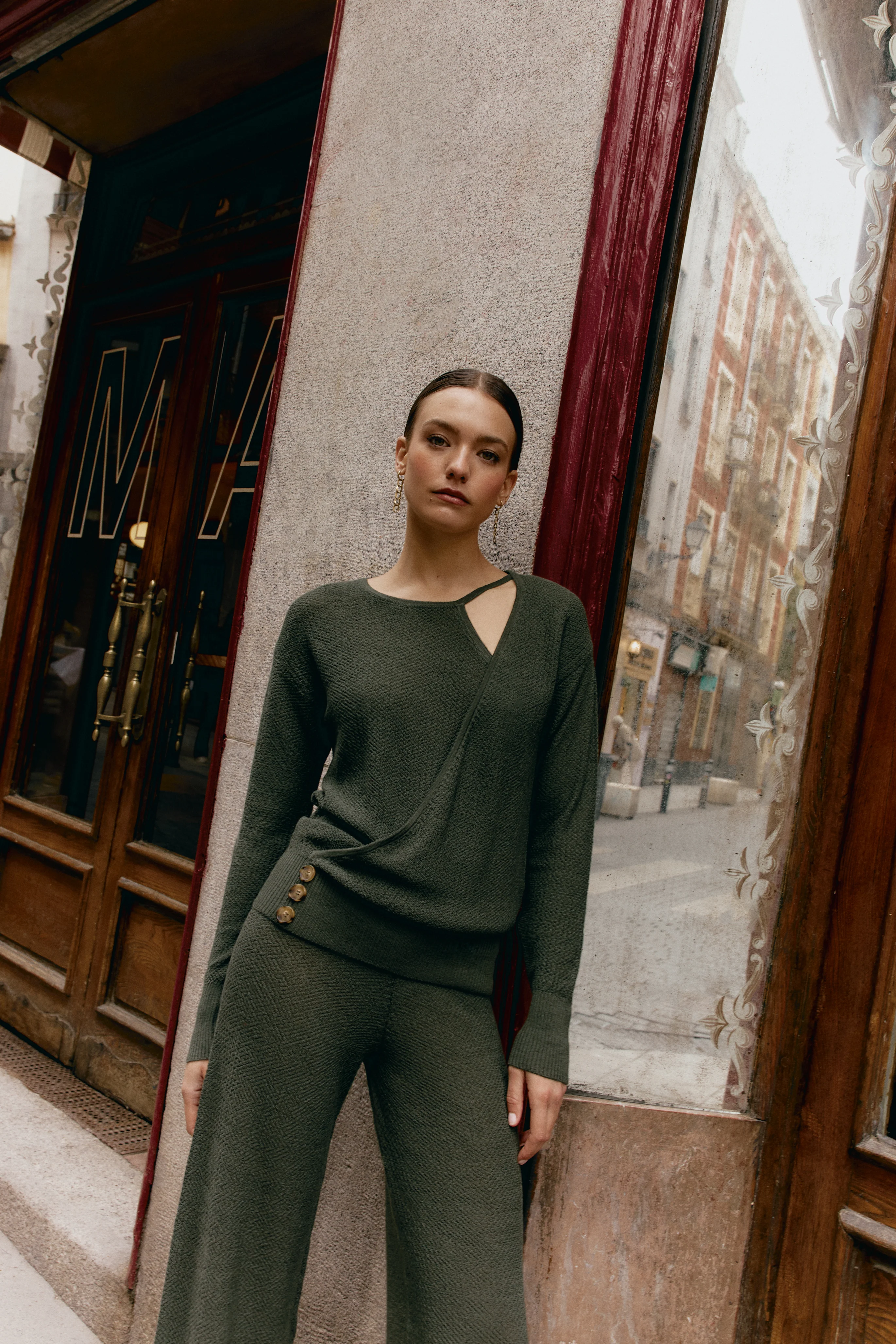 Pantalón flare en punto de arroz de talle alto. El pantalón está confeccionado en hilatura de lana merino extrafine, una materia de mano cálida que se adapta a la figura sin ceñir. El patrón clásico de AKALA que favorece al cuerpo, pensado para la comodidad del día a día. Combínalo con el top Cortona para un total look de punto.
