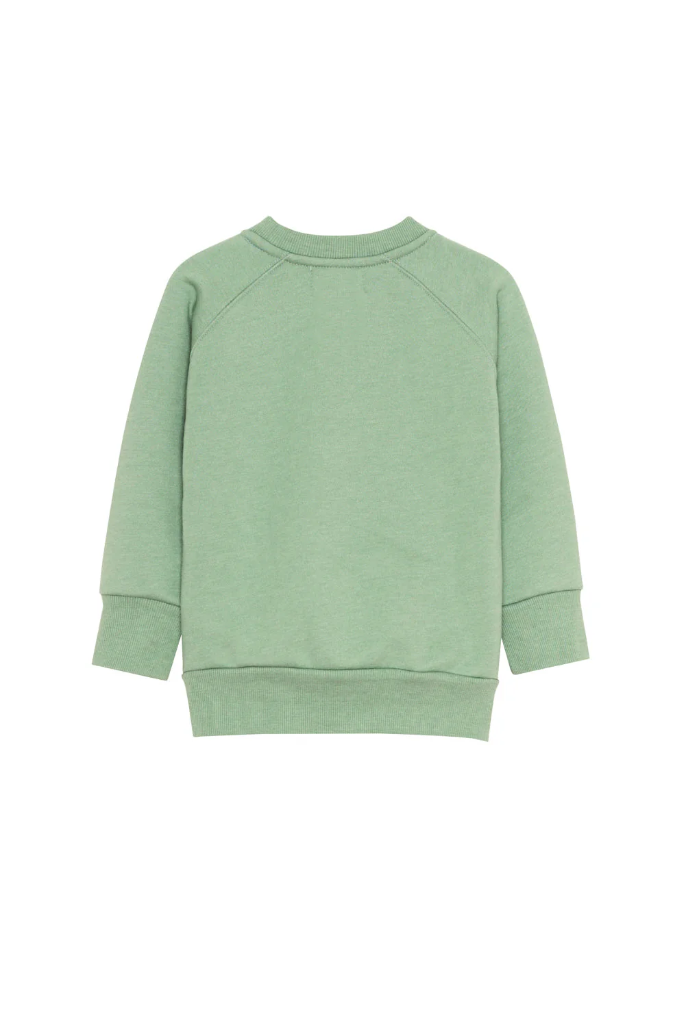 Sudadera en felpa americana perchada de cuello redondo. La sudadera tiene largo a la cadera con bajo y puños elásticos. La prenda ha sido confeccionada mediante el proceso de tinte en prenda, obteniendo colores vibrantes desarrollados para la colección. Manga raglan para mayor comodidad