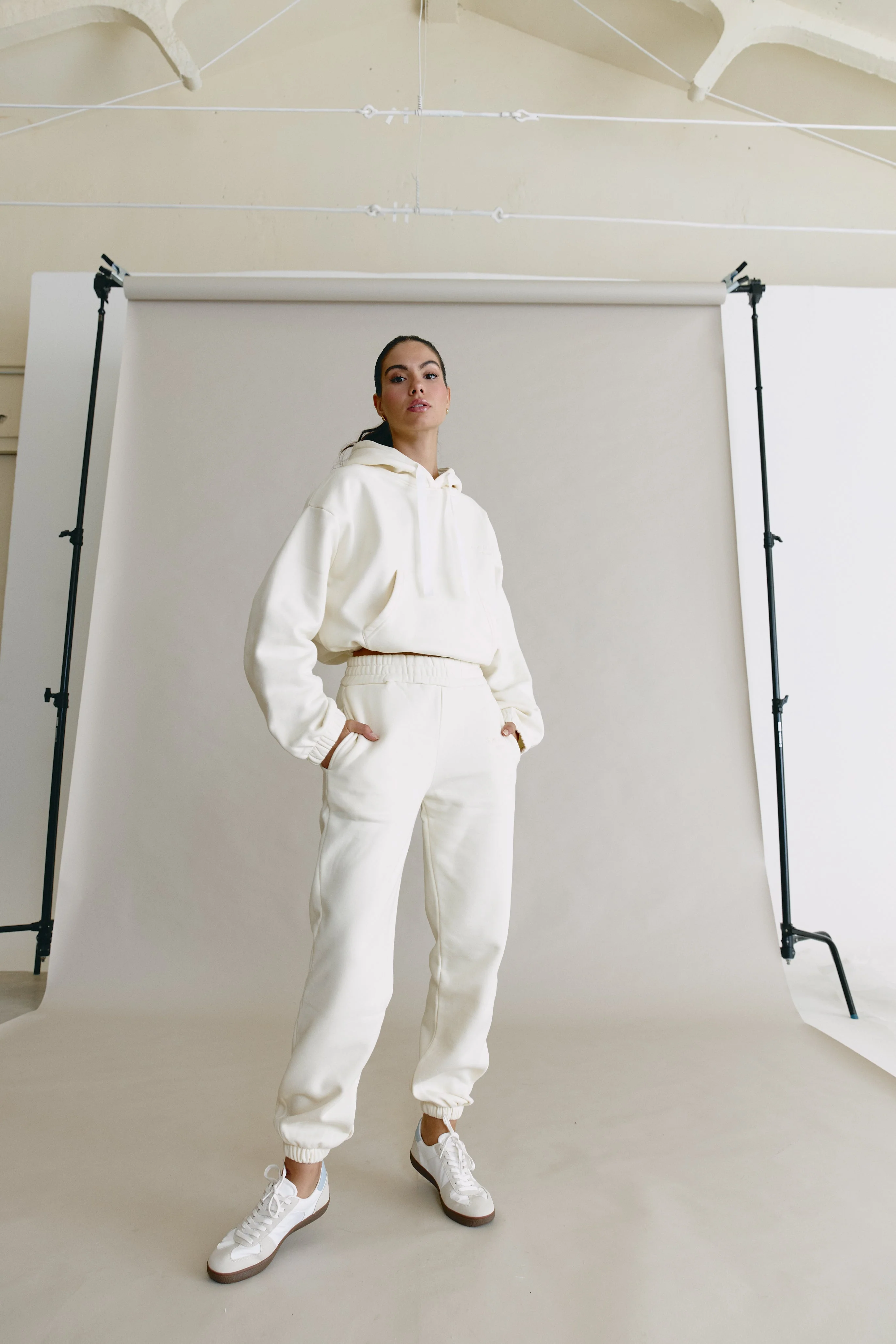 Pantalón inspiración jogger en felpa americana perchada. El pantalón tiene cinturilla y bajo elásticos que se ajustan para una silueta jogger. El pantalón es de tiro alto, perfecto para combinar con la sudadera o con un crop top. La prenda ha sido confeccionada mediante el proceso de tinte en prenda, obteniendo colores vibrantes desarrollados para la colección