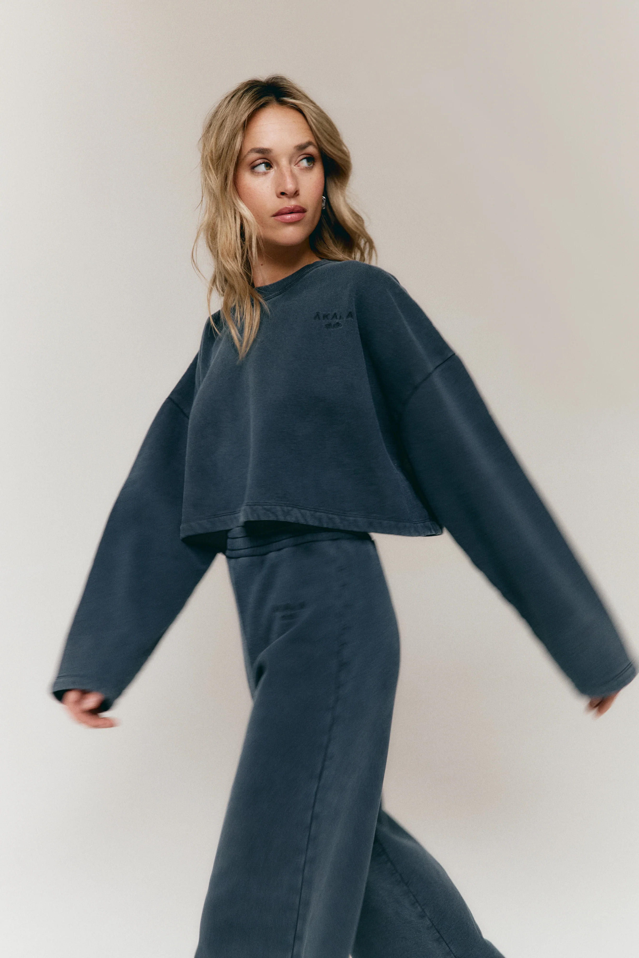 Sudadera crop de felpa 100% algodón con acabado interior perchado que aporta calidez y suavidad. La sudadera es de cuello redondo con logo bordado a tono, manga ancha y hombro caído para un efecto oversized. El color de la prenda tiene un efecto fade out que crea un tono desgastado, desarrollado en exclusiva para la colección.