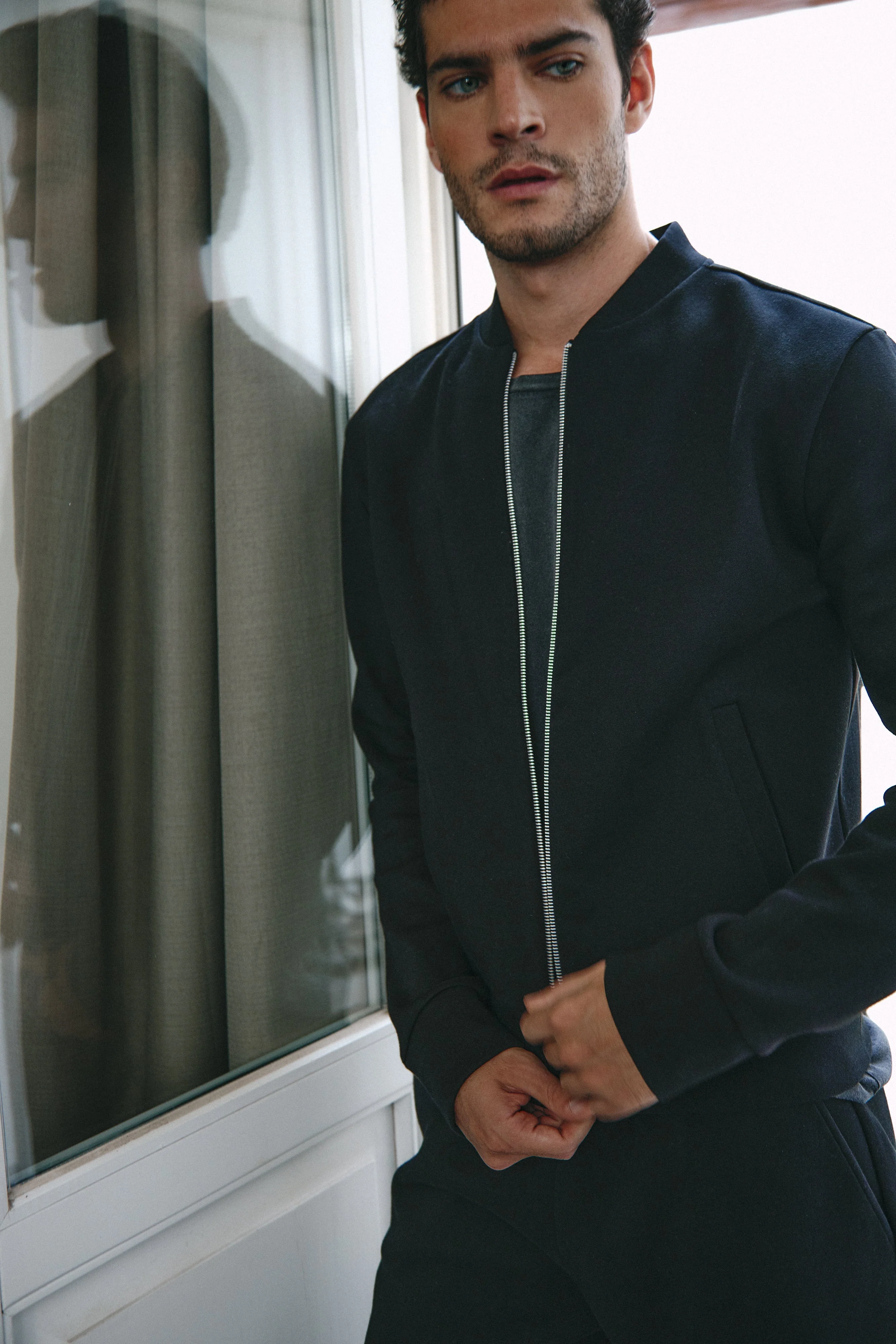 Cazadora bomber de neopreno con cierre de cremallera, confeccionada en algodón, presenta un diseño con cuello, puños y bajos marcados. Dispone de bolsillos laterales presentando un diseño relajado a la vez que elegante. Modelo lleva talla M