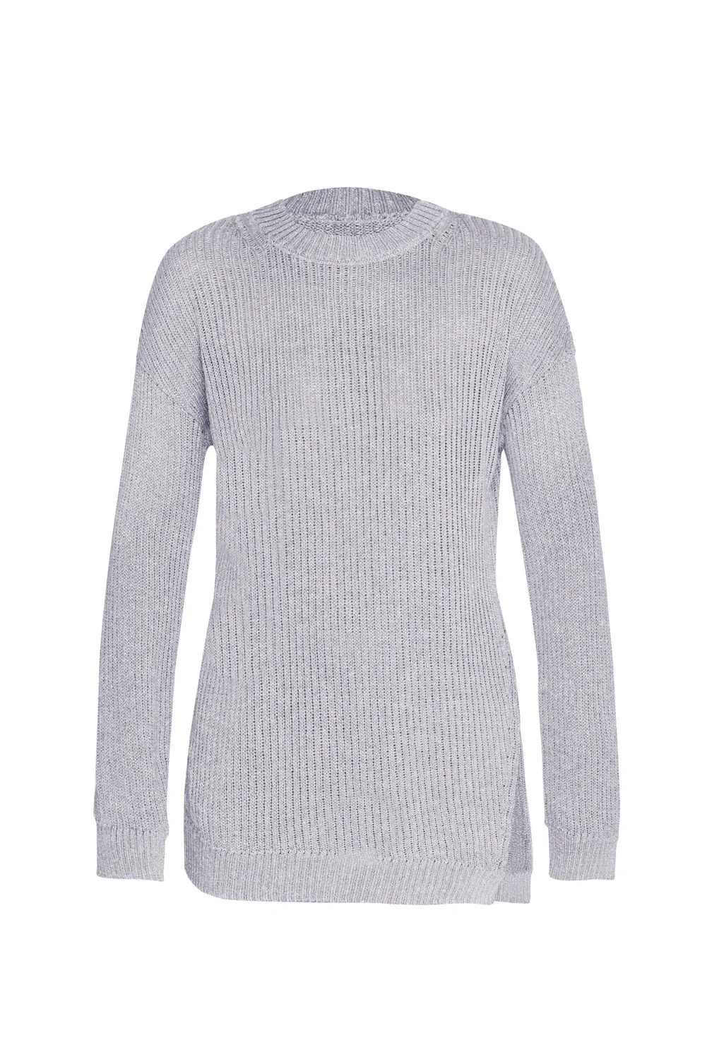 Jersey asimétrico con acabado brillo y corte slim fit. El jersey está confeccionado en punto desprendido, una técnica que se adapta a la silueta con una caída elegante y cómoda. El jersey tiene una apertura lateral a la altura de la cintura que realza la asimetría y le da un aire desenfadado. La hilatura con lurex aporta luz. Llevalo con el pantalón palermo para una silueta elegante y un total look.