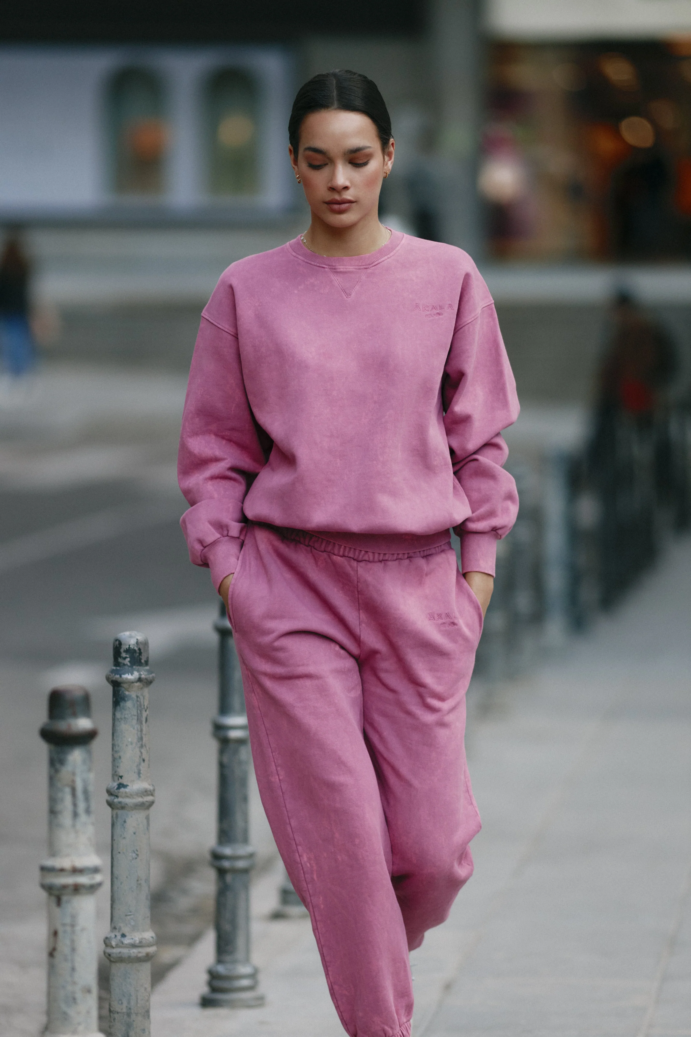 Pantalón en felpa 100% algodón, con cinturilla y bajo elásticos que se ajustan para una silueta con inspiración jogger. El pantalón es de tiro alto, perfecto para combinar con la sudadera o con un crop top. Además, el efecto skywash otorga un carácter único en colores vibrantes.