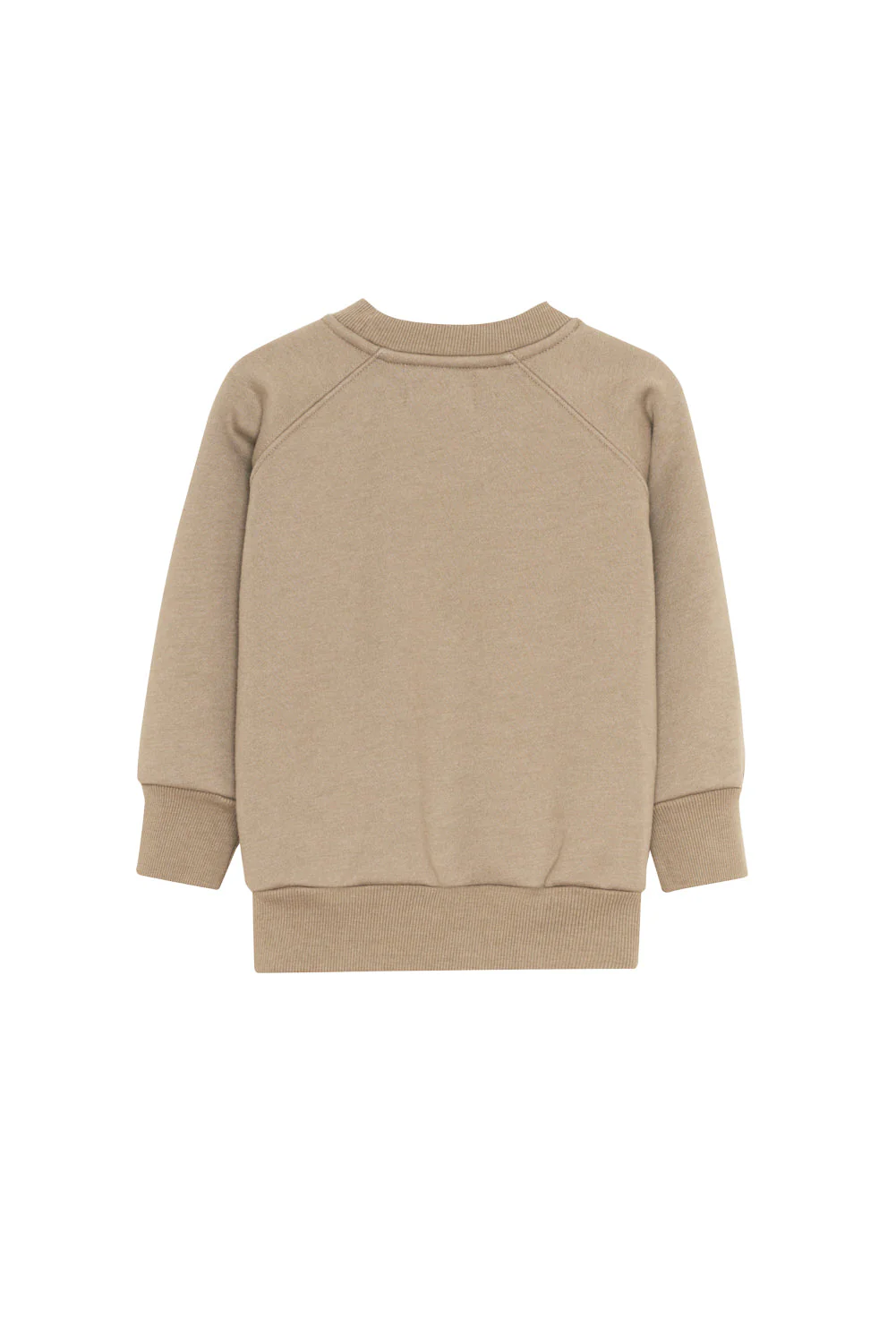 Sudadera en felpa americana perchada de cuello redondo. La sudadera tiene largo a la cadera con bajo y puños elásticos. La prenda ha sido confeccionada mediante el proceso de tinte en prenda, obteniendo colores vibrantes desarrollados para la colección. Manga raglan para mayor comodidad